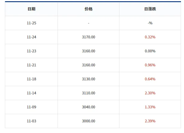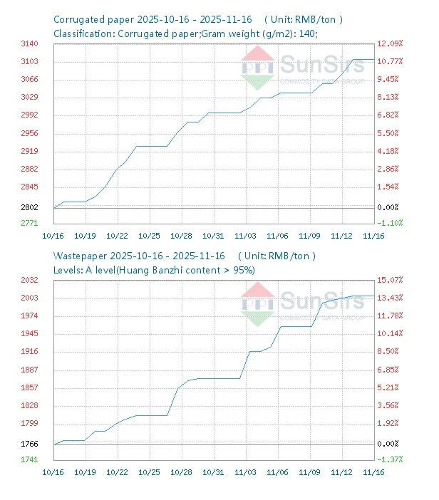 สำหรับกระดาษลูกฟูกขนาด 140 กรัม/ตร.ม. ราคาเพิ่มขึ้น 12.09% ระหว่างวันที่ 16 ตุลาคม ถึง 16 พฤศจิกายน 2025 ในช่วงเวลาที่ยาวนานขึ้น (27 สิงหาคม ถึง 25 พฤศจิกายน) กำไรสะสมพุ่งสูงถึง 20.99% ภายในวันที่ 24 พฤศจิกายน ราคาล่าสุดสูงถึง 3,170 หยวนต่อตัน โดยมีการปรับขึ้นเล็กน้อยอย่างต่อเนื่อง